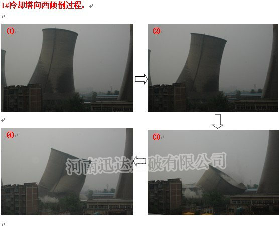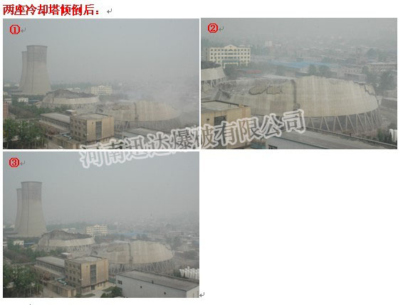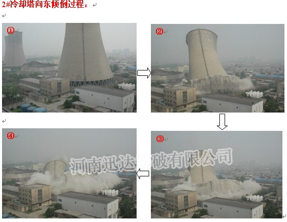 由于周围居民楼房多、厂区设备多,为保证凉水塔能够成功拆除,我公司经过反复的研究论证,制定出了安全可行的施工方案。2011年4月22日成功地将焦作电厂1#、2#两座凉水塔进行了定向拆除。